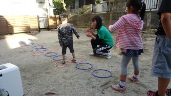 お天気の良い日は、庭にケンケンパのコースを作って、みんなでリレーをします!