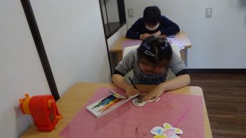 制作活動では、白い画用紙に色を塗って、オリジナルの蝶々を作りました。